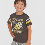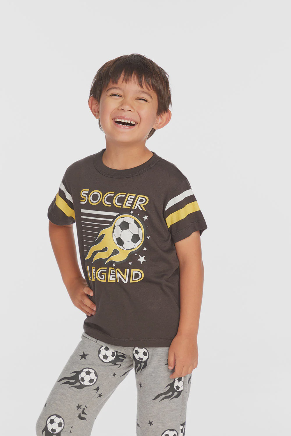 Unleash his inner soccer legend with this tee. The cotton polyester rayon blend offers a comfortable fit while the yellow and white stripes on the sleeves add a touch of style. Complete the look with the matching boys Soccer Legend pants and kicks.