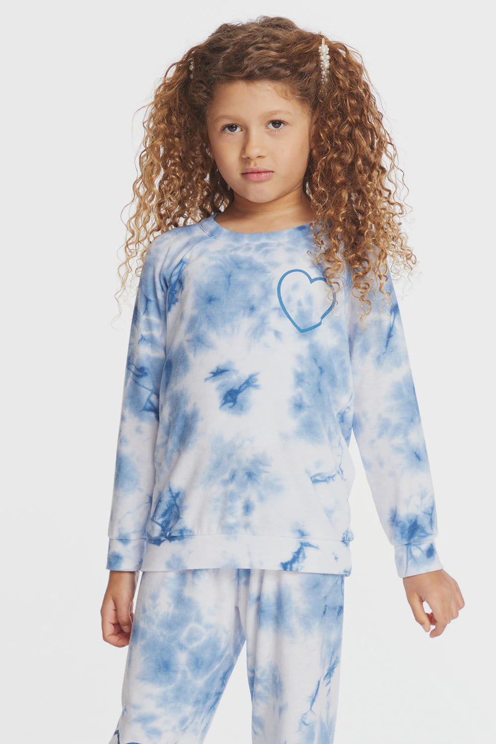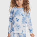 With a light blue and white tie dye cloud motif, this cozy sweatshirt will have them feeling groovy. A sweet blue heart on the front of the design completes the look. Pair with our matching denim tie dye heart pants for the sweetest set.