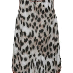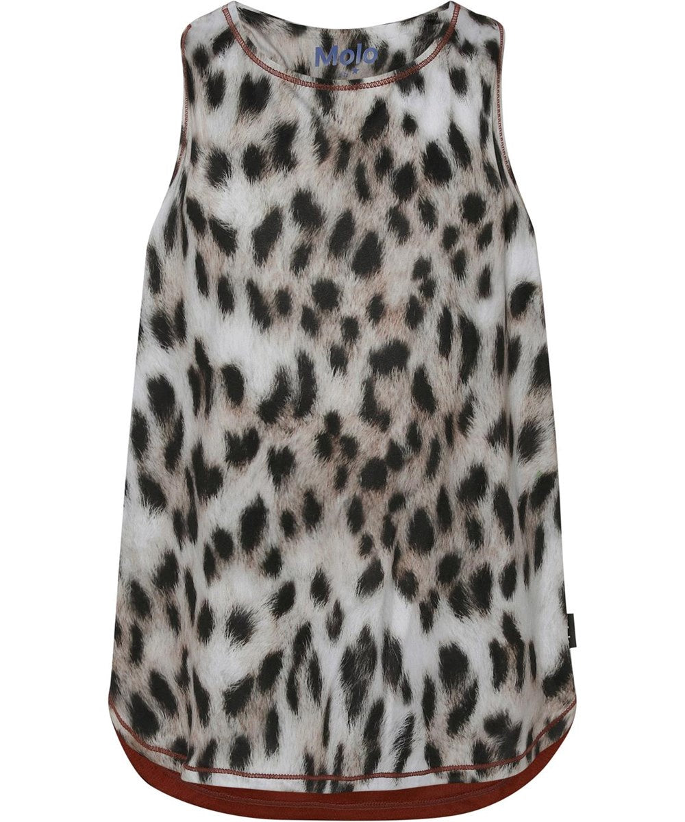 Oriana is a sports top with a snow leopard print and a brown back with wide straps that have a text. The top is part of Molo's sports collection, which seamlessly unites fashion and sports. It is comfortable and made in technical materials. Molo’s sports collection is made with a unique, high-performance technology called HeiQ Smart Temp, which supports the body’s natural ability to cool itself down. The cooling function is activated when you are warm and sweating. The cooling function becomes deactivated when the body has cooled down.