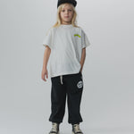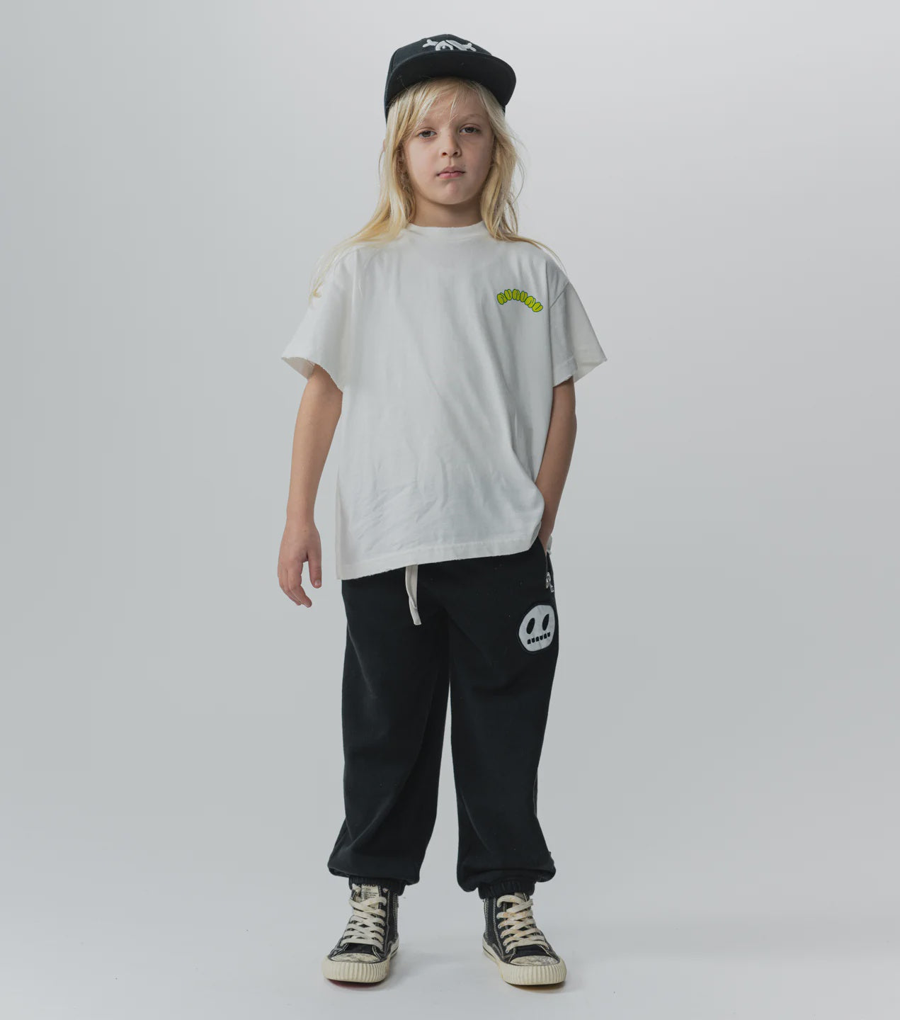 when your kid is feeling a little inside out, this gender-neutral fit will be their go to. it’s made of white heavy single cotton and branded with our bubbly nununu logo. it’s got deconstructed hems plus the seams on the outside to match their mood. to keep up the edginess, the front seam line has that deconstruction but the back’s is left raw & rolling up. kinda like how your kid gets bored halfway through doing something and decides to make mischief elsewhere.