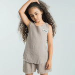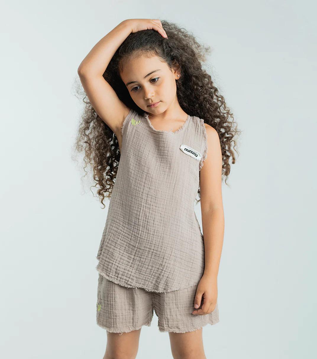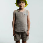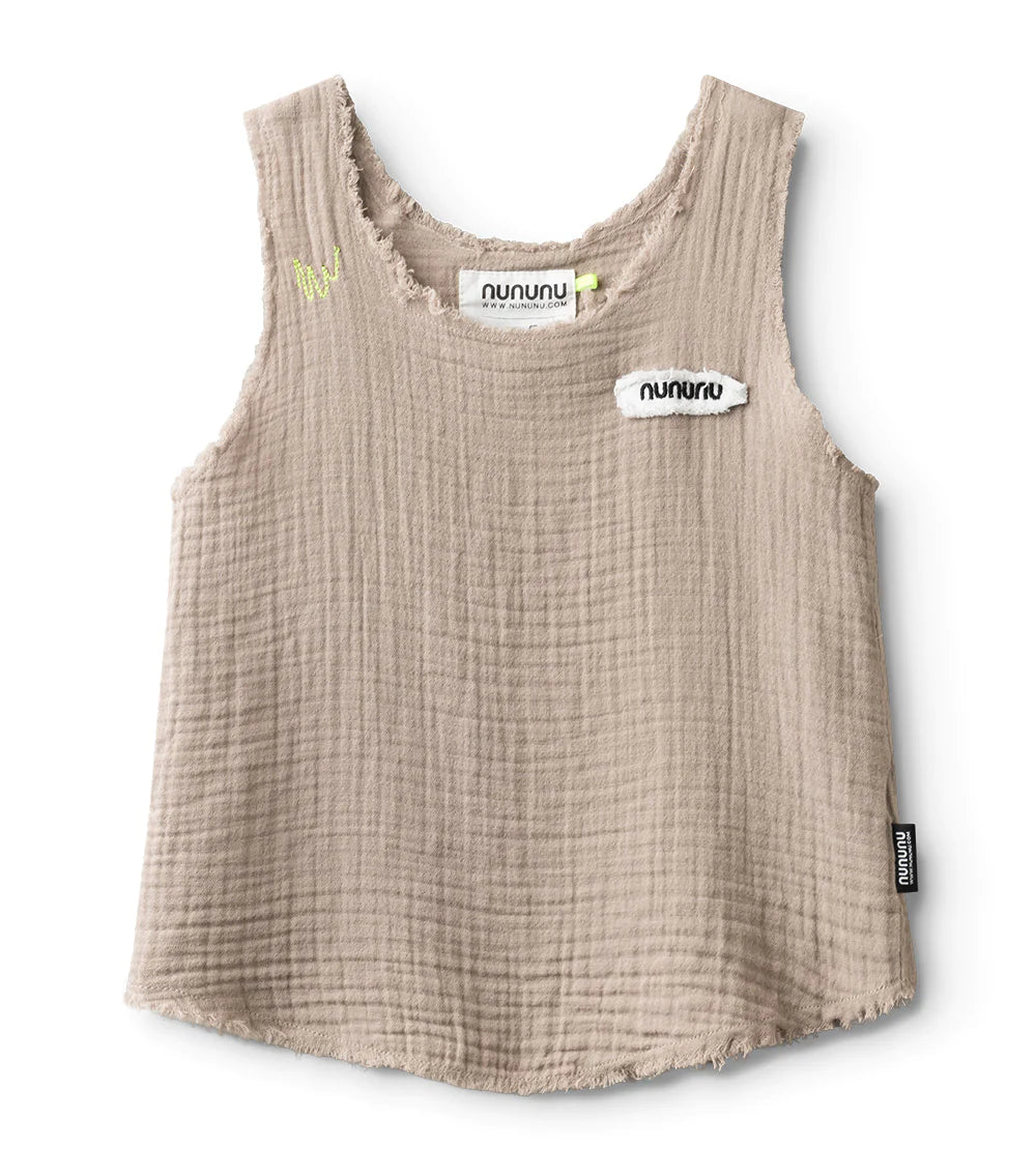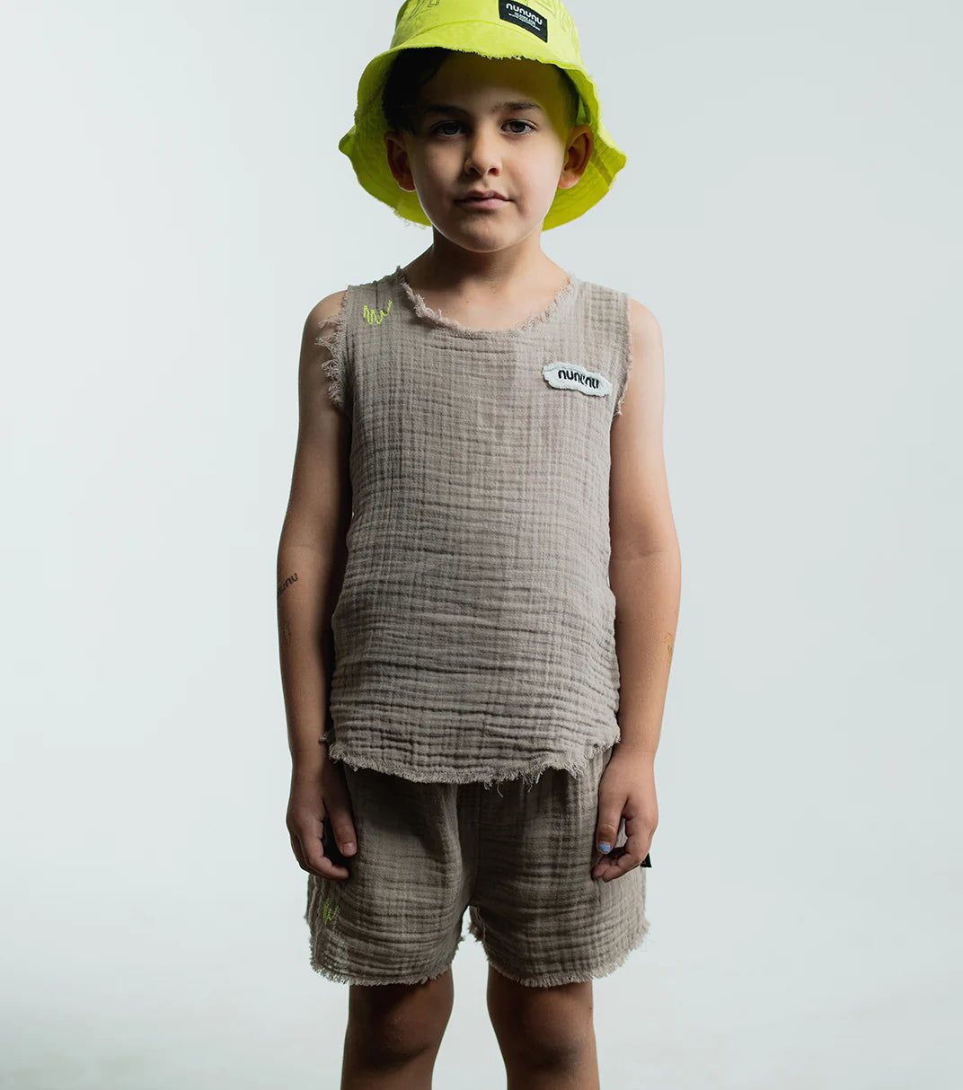 minimalism meets true summer comfort in our easy-breezy stone cotton muslin tank top. light & textured, it’s got shredded edges for a raw look, echoed by our frayed logo patch at the chest. a relaxed fit & rounded hem keep it cool as hell, while a neon squiggly design brings the tiniest pop of color to the hip. pair it with our matching muslin shorts or muslin beach skirt—or mix it up with swimwear or whatever you want. isn’t summer the coolest?