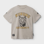 congrats on your kid’s acceptance to the nununu university. this smokey grey heavy single cotton fit with custom deconstruction at the hems is the perfect way to kick off their future studying the art of looking cool & badass all day every day. it's got our logo print in a yellow as bright as your kid with a black outline as bold as they are too. this fit has the full college vibe plus a big old cat on the front to show off our fierce mascot. it’s got a lightning bolt on each sleeve in black because the kid wearing this t is so bright, they’re practically a light & energy source.