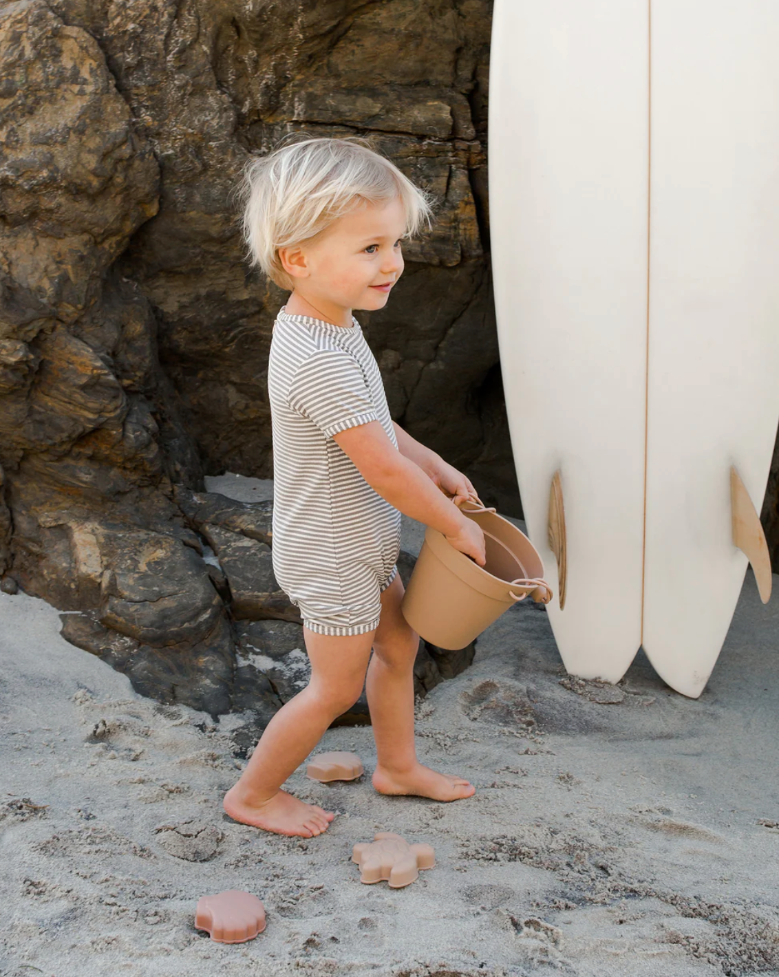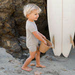 Our 'shorty onepiece' is an adorable way to keep your little one protected from the sun in style. Zipper closure at the back and snaps at the leg openings for easy changing.