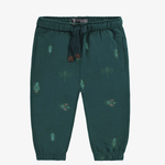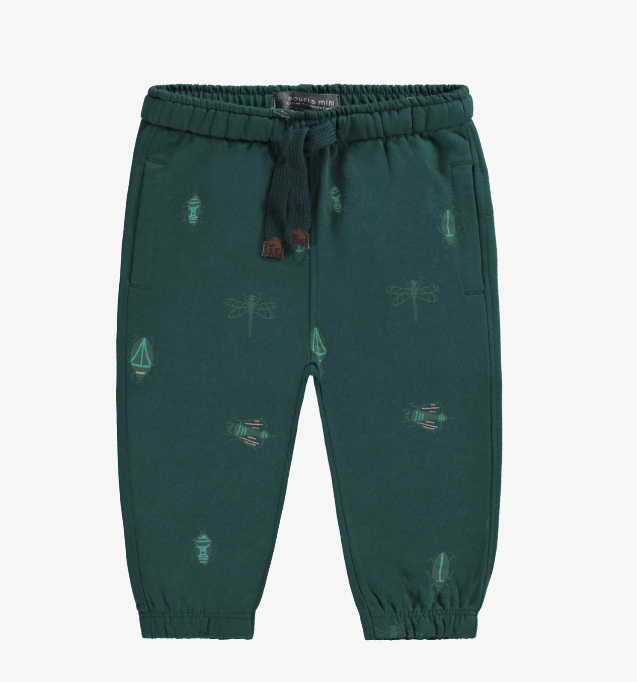 Regular fit and length green pants with three pockets, elastic waistband with adjustable cord, an all over print with insects, in 100% French terry.