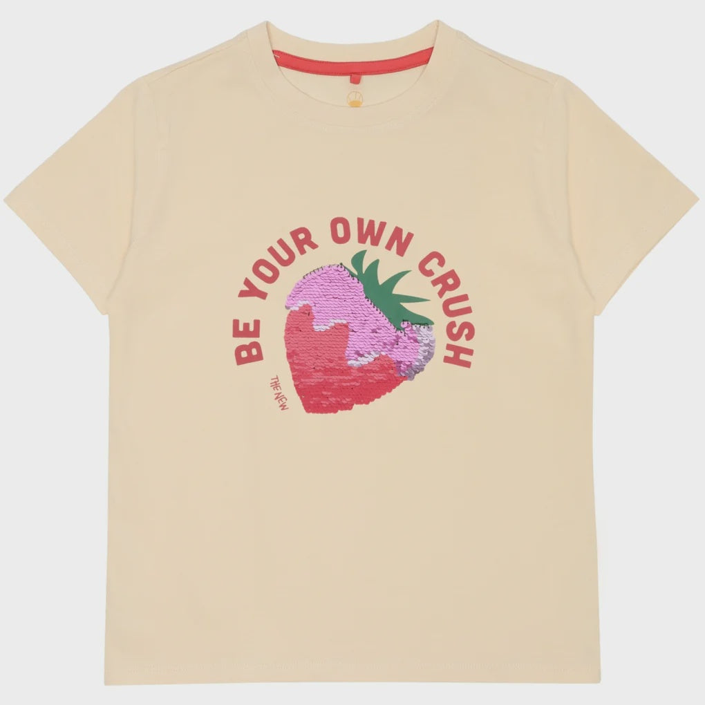 Beige THE NEW t-shirt featuring a cute print of a delicious strawberry surrounded by the text 'Be your own crush.' Additionally, the strawberry is made of reversible sequins, allowing the t-shirt to quickly change its appearance. This delightful t-shirt for girls is made of organic cotton and elastane, making it soft, breathable, stretchy, and gentle on the skin.