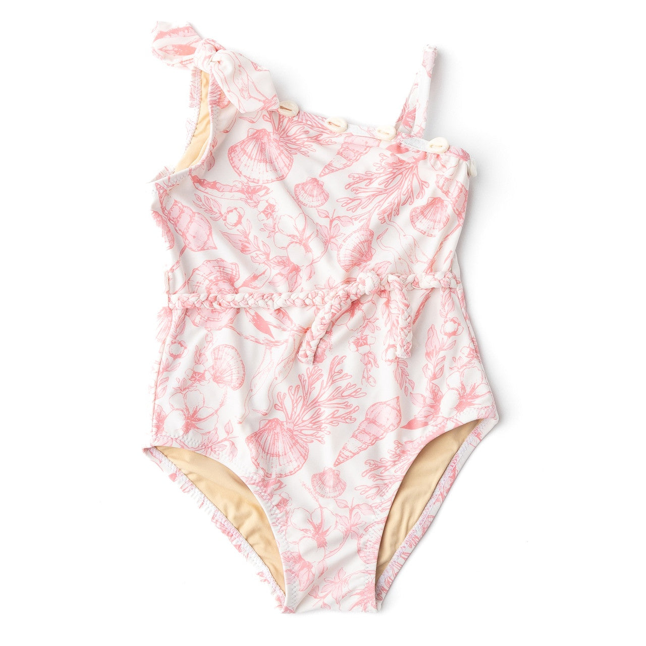 Let her channel the perfect beach vibes with the Seaside Toile Girls Shell One Shoulder Swimsuit Set. This stylish one-piece swimsuit features chic braided belt detailing and a unique one-shoulder design for a fashionable, standout look by the pool or at the beach. The playful seashell print adds a touch of ocean-inspired charm that’s both timeless and trendy. With adjustable straps, you can ensure a custom fit for growing girls, while the fully lined interior keeps her comfortable during hours of fun in the sun. The swimsuit is designed with flat zig-zag stitching for added durability and a smooth, polished finish. The full cut coverage ensures extra comfort and confidence, whether she’s splashing in the waves or lounging in the sun.