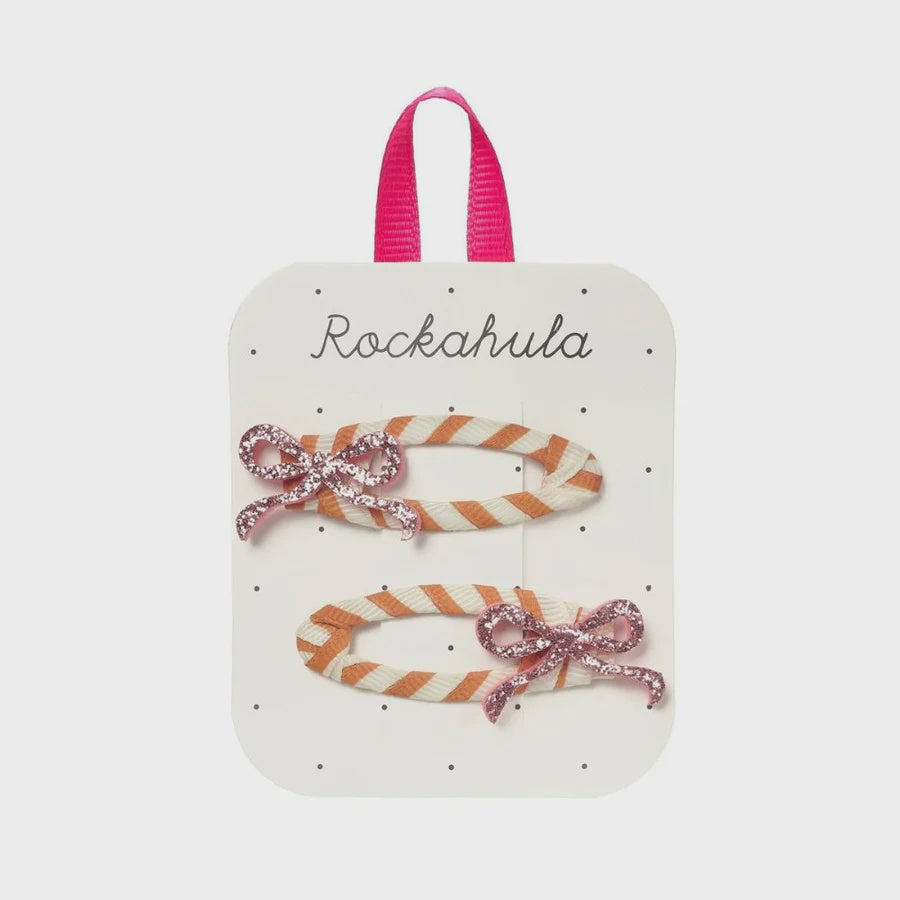 Add a sparkling touch to your little one’s hairstyle with the Rockahula Stripy Glitter Bow Clips. Each glittering pink bow sits atop a bright, stripy ribbon-wrapped snap clip, combining playful design with secure styling. Made from recycled felt, glitter, and ribbon, these bows are perfect for everyday wear, parties, or imaginative dress-up, bringing fun and sparkle to any outfit.