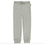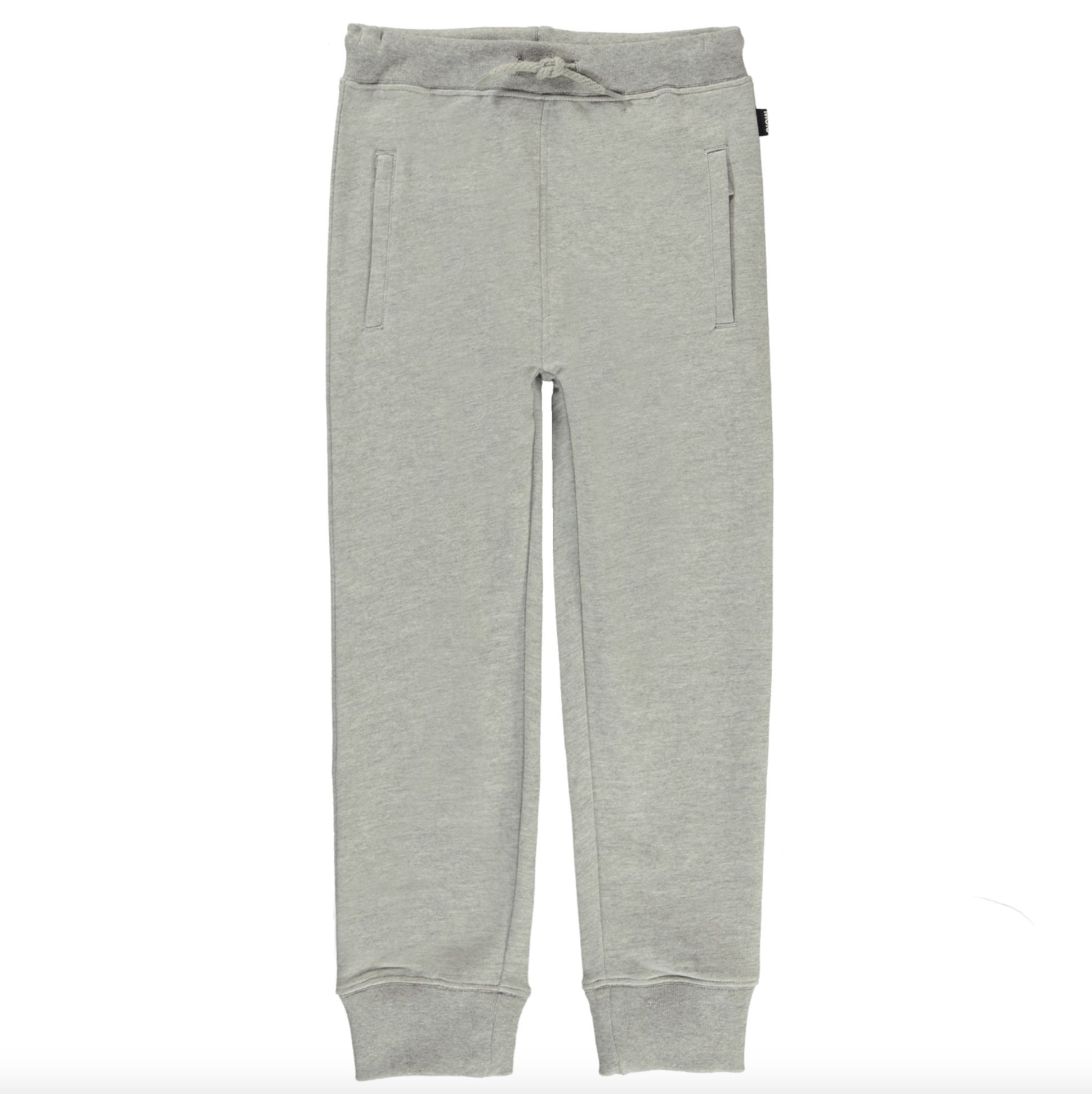 Afon is a pair of slim fit sweatpants in grey. The sweats have elastic at the waist with ties and elastic at the legs.