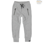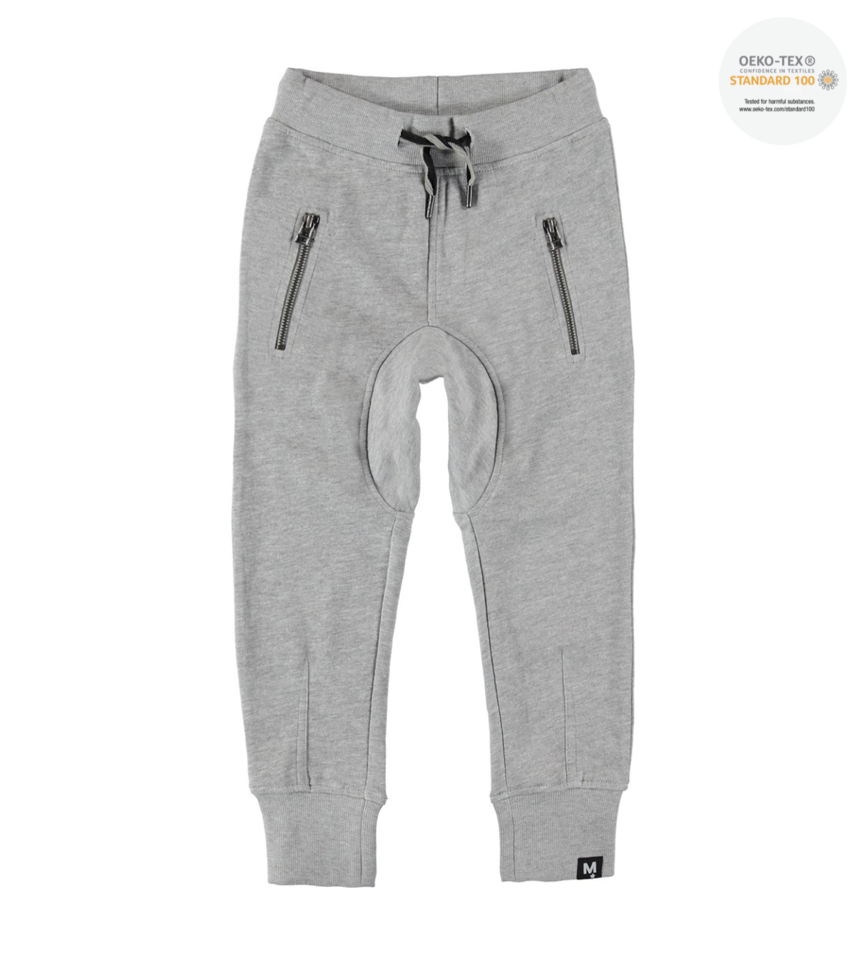 Ashton is one of Molo's favourites because they are both comfortable and good looking. Ashton is a pair of grey sweatspants with a wide, elastic waist with a low crotch. They have sporty details like ties and zip pockets at the sides. This product is Oeko-Tex certified.