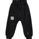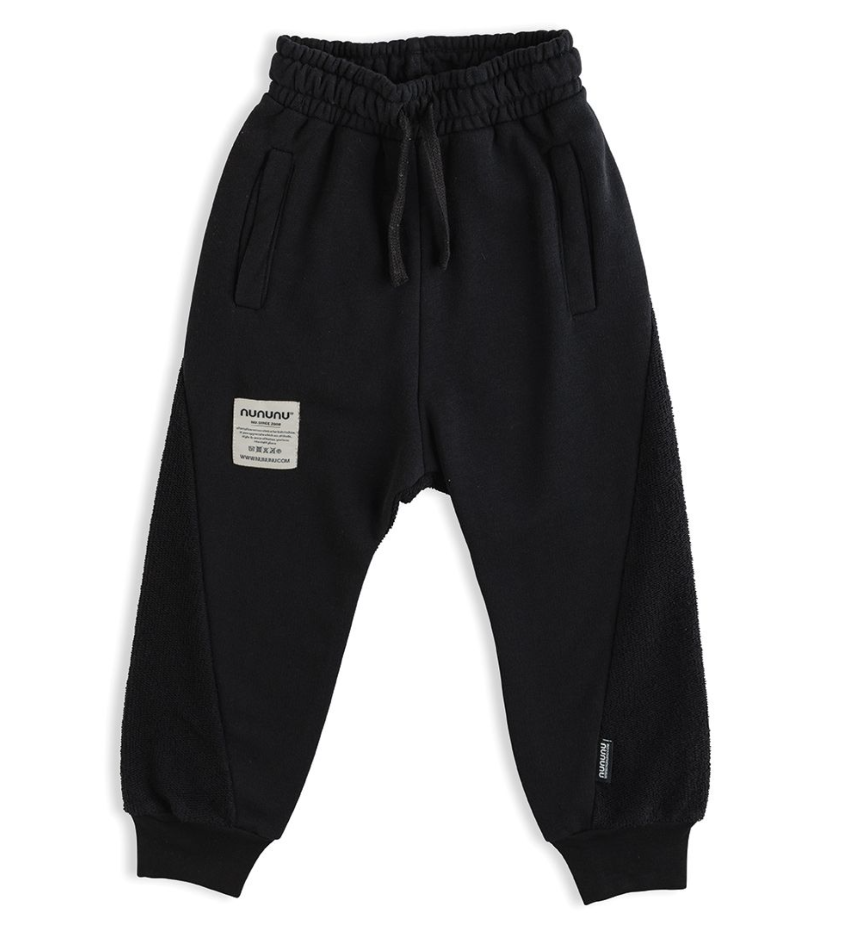 right-side-out in front, inside-out in back, these black french terry sweatpants are giving a lot of textural interest for a simple basic unisex bottom. the two zones are separated by cleverly placed, angled, wrap-around seams. front pockets & an elastic drawstring waist finish the deal. the care tag is on the outside of the right thigh, because we don’t do things like everyone else.