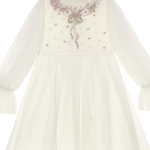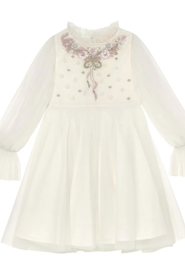Wrap her in a winter wonderland with the Rosy Ribbons Tulle Dress in Milk. Its airy tulle skirt twirls like snowflakes in the breeze, with long sleeves that gather into elastic cuffs flaring with soft tulle ruffles. A gentle tulle frill frames the neckline, and the bodice shines with floral details and a dazzling bow, the perfect festive frock to sparkle all season long.