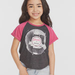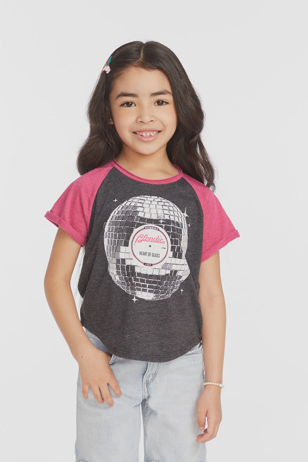 Moms! Give your daughter some disco fever with this Blondie Heart of Glass tee! Made from a soft cotton polyester blend, this black tee with pink sleeves features a groovy graphic of a disco ball with the band name. Perfect to pair with jeans and bootsys!