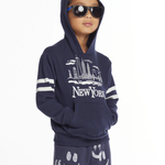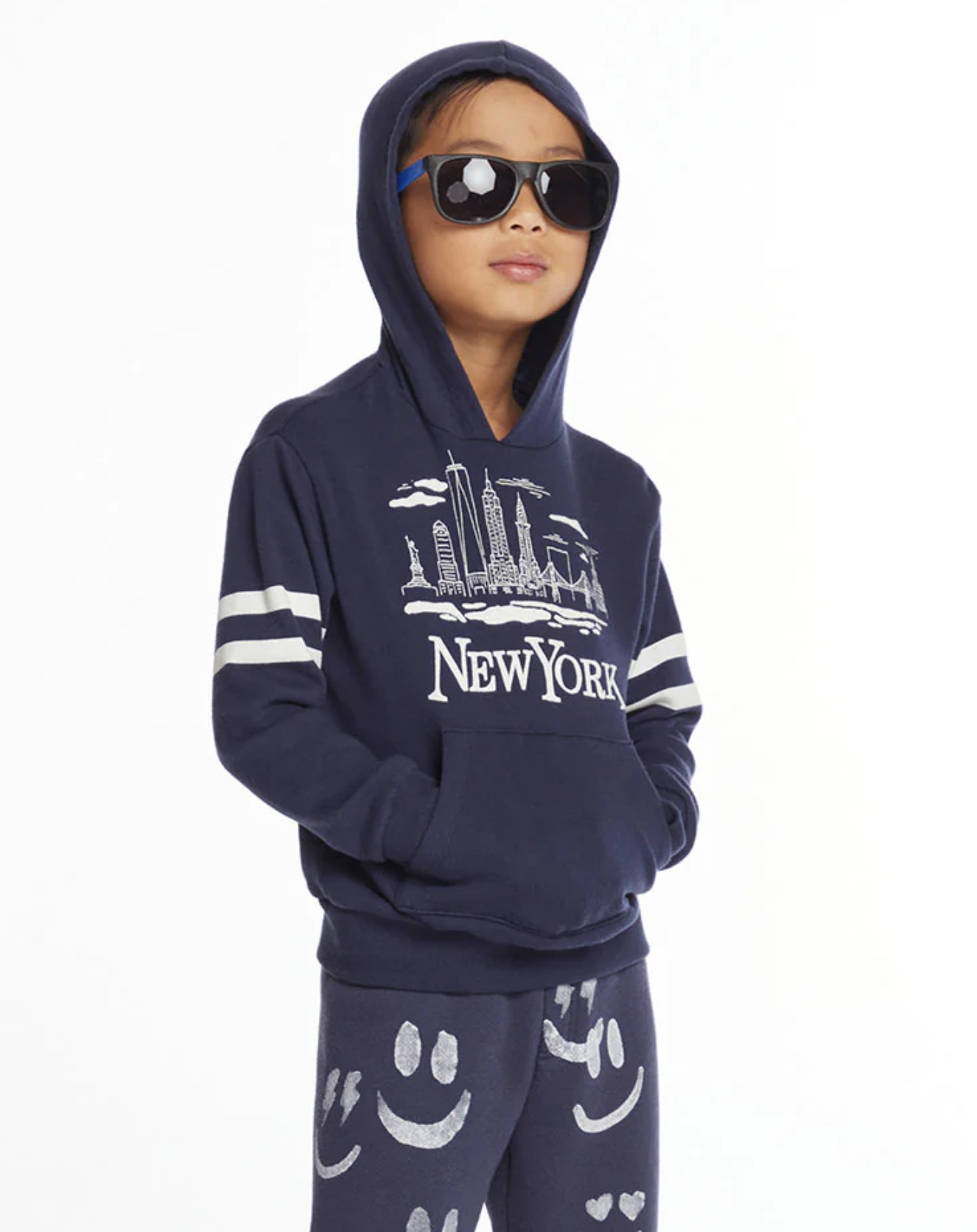 Hey you, urban aficionados! This cool hoodie will transport you to the Big Apple. With its old school lettering and sketched cityscape, it's sure to become your go-to. And don't forget the funky striped sleeve for some throwback flare!
