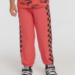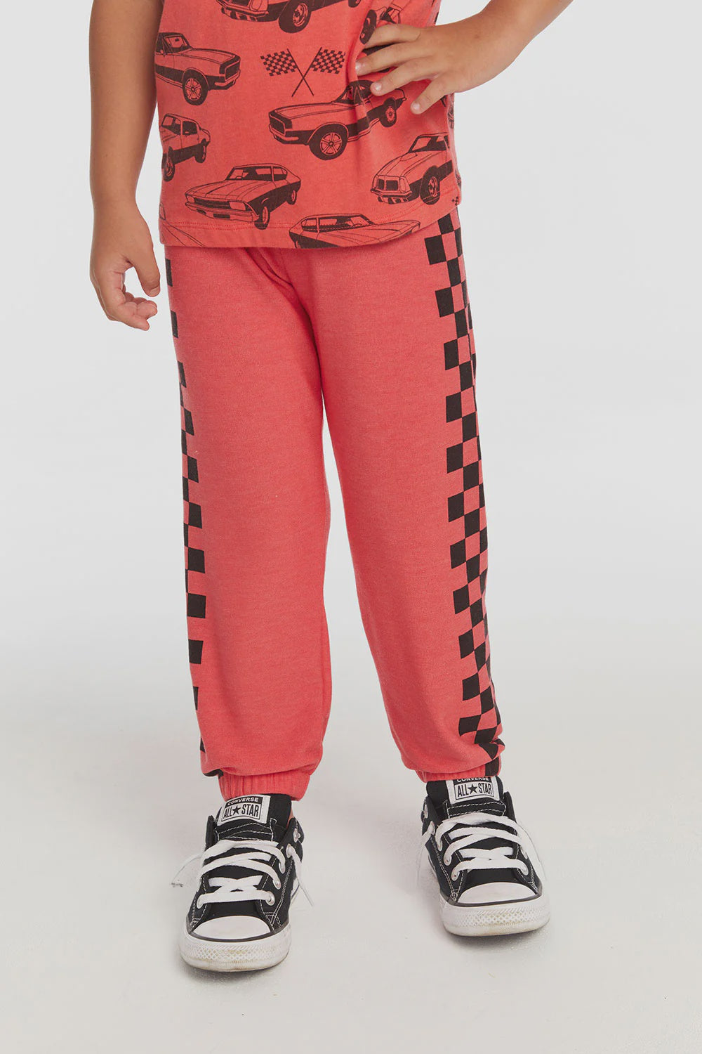 Get ready to rev up your little dude's style with these Racer Boys Pants! Made with a lightweight polyester rayon blend, these flame red pants feature a bold checkered flag graphic down the sides. Pair with the matching "Allover Racing" tee and sneakers for a winning look. Ideal for the mom who shops for her son with a playful sense of style.