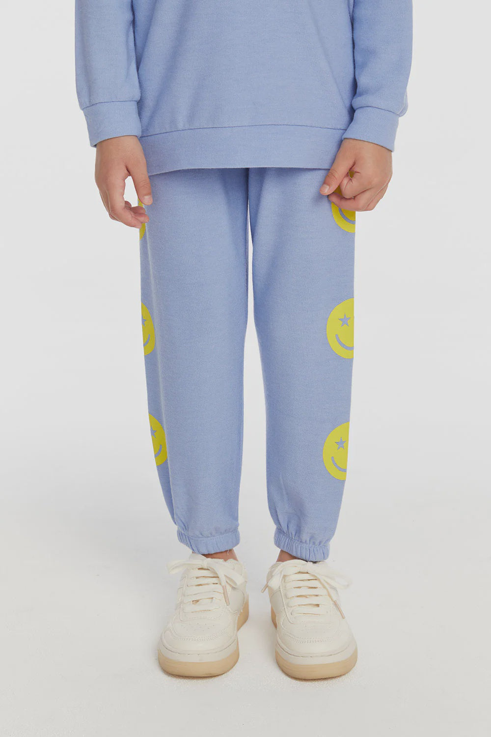 Get your little fashionista ready to slay in the Star Smiley Slim Slouchy Pants. Made with a cozy knit blend, these blue hydrangea pants feature a playful smiley face and starry eyes print down the legs. Perfectly paired with the matching pullover and her favorite kicks. (Happy daughter = happy mom!)