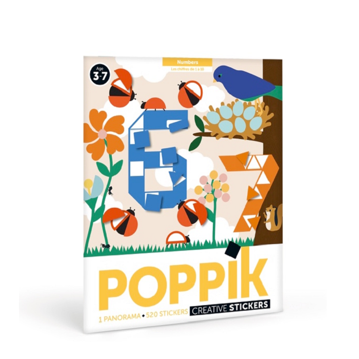 Here is a wonderful decoration on the theme of nature. Each figure from 1 to 10 is illustrated by animals, plants: 1 cactus, 2 cheetahs, 3 caterpillars, 4 fish, 5 flowers, 6 ladybugs, etc. The children stick the missing stickers on the panorama and they discover all the details hidden in the picture. A very decorative Poppik to learn numbers while having fun.