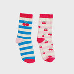 Our two pack of super soft socks feature pink and blue stripes and plenty of cherries! Made with organic cotton, they're perfect for everyday activities. Match with our sweet cherry collection for the perfect combo!
