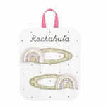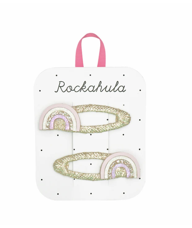Fall under our magical spell and discover a world of enchantment with our shimmering rainbow clip set. Made from the softest colour palette with a hint of sparkling gold and set onto gold wrapped snap clips.