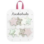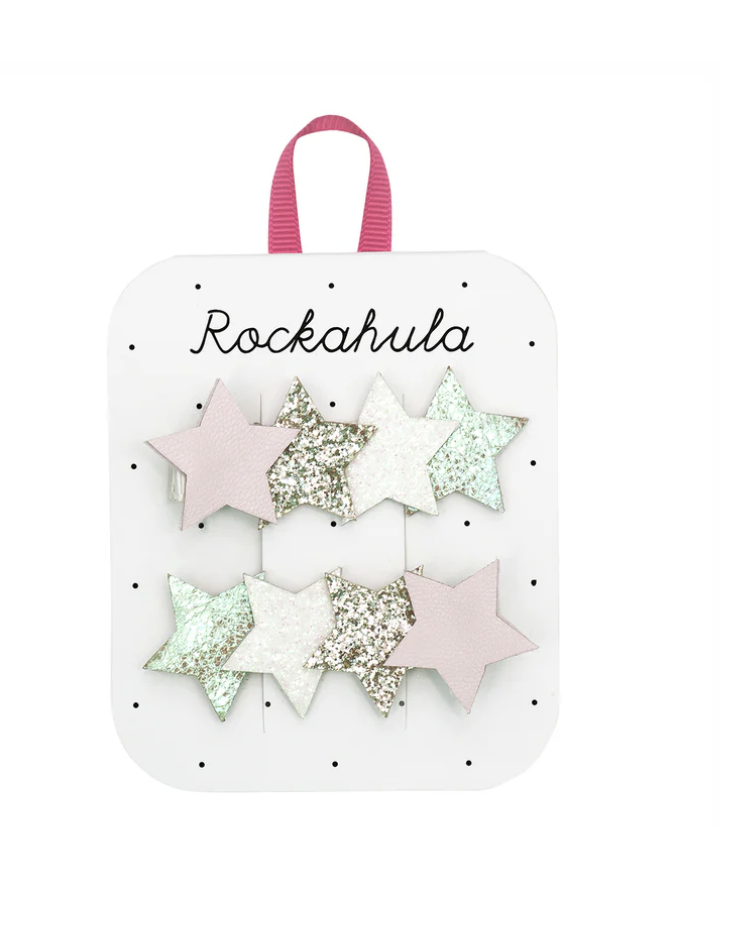 Two salon bar clips covered in grosgrain ribbon, adorned with a glistening row of pastel and iridescent coloured stars. Perfect for adding a touch of elegance and shimmer!
