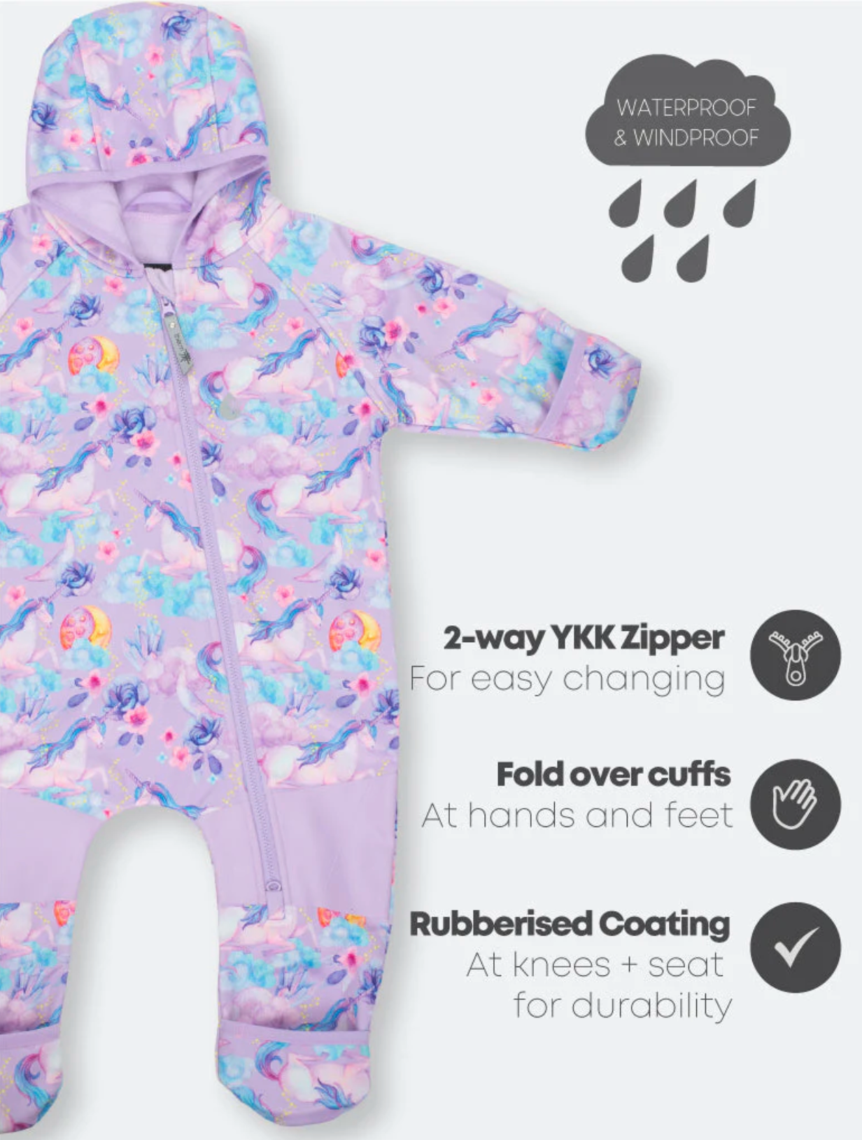 Our cozy onesie combines soft fleece with a full weather protective waterproof & windproof outer shell. A comfortable, all-in-one with a soft and stretchy feel, bonded with ultra-soft microfleece lining for warmth. From crawlers through to walkers, this versatile suit is an ideal choice in chilly, rainy, or snowy conditions.
