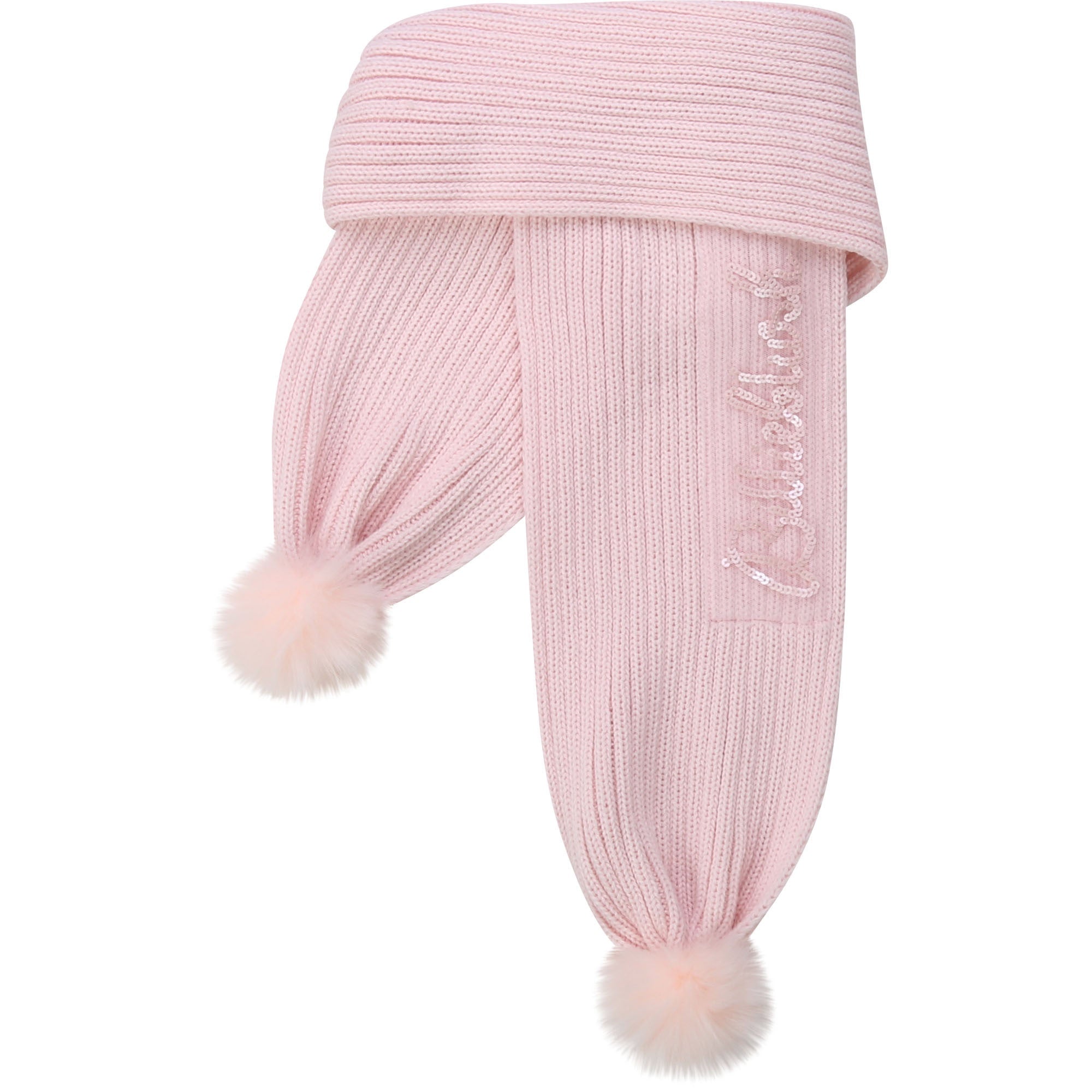 Girls knitted scarf by Billieblush, in pale pink. It has a pale pink sequinned logo and fun faux fur pom-poms.