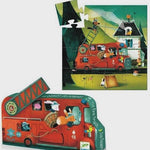Discover the Fire Truck puzzle by Djeco, a beautiful 16-piece puzzle for children from 3 years old, presented in a round silhouette box with a mobile ladder on top.