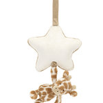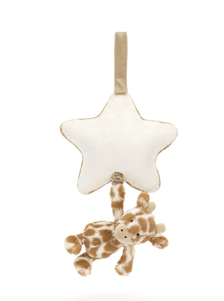 The Bashful Giraffe Musical Pull is a soothing gift to help babies drift off. Our most loved giraffe has gorgeous yellow fur with dark orange patches made with recycled fibers and holds on tight to a concertina pull. Gently pull the giraffe and an original Jellycat lullaby will play from the stylishly monochrome trimmed star.