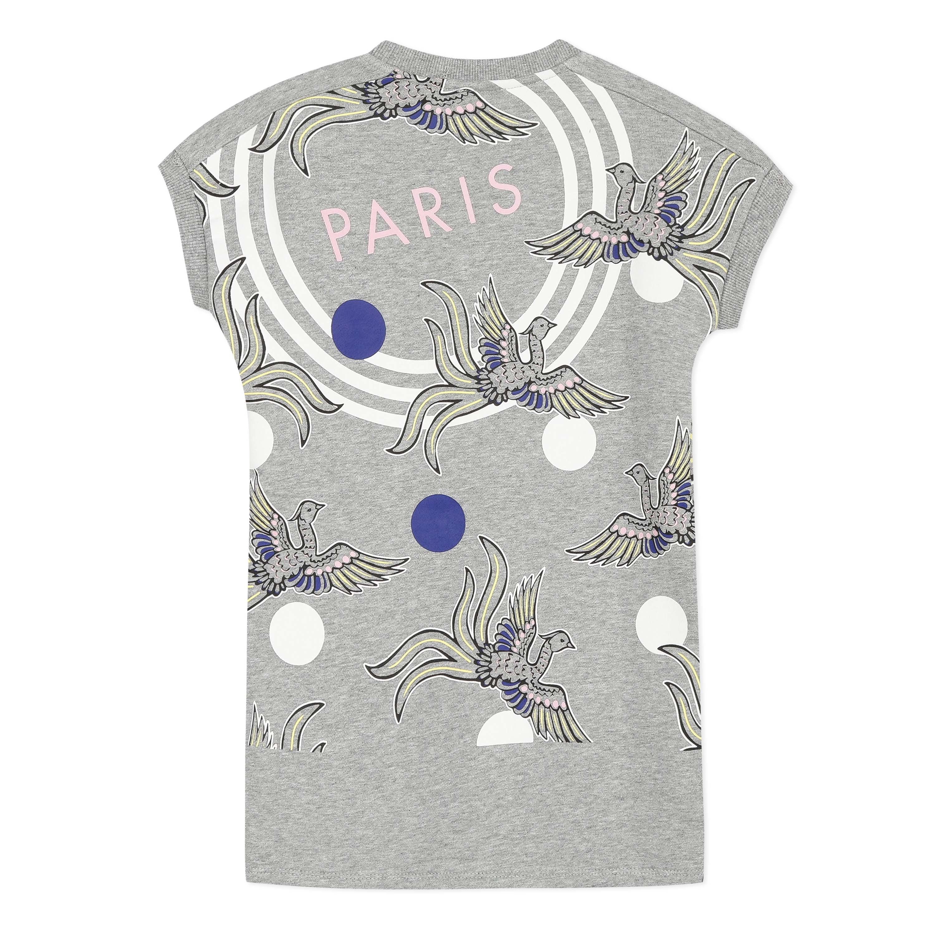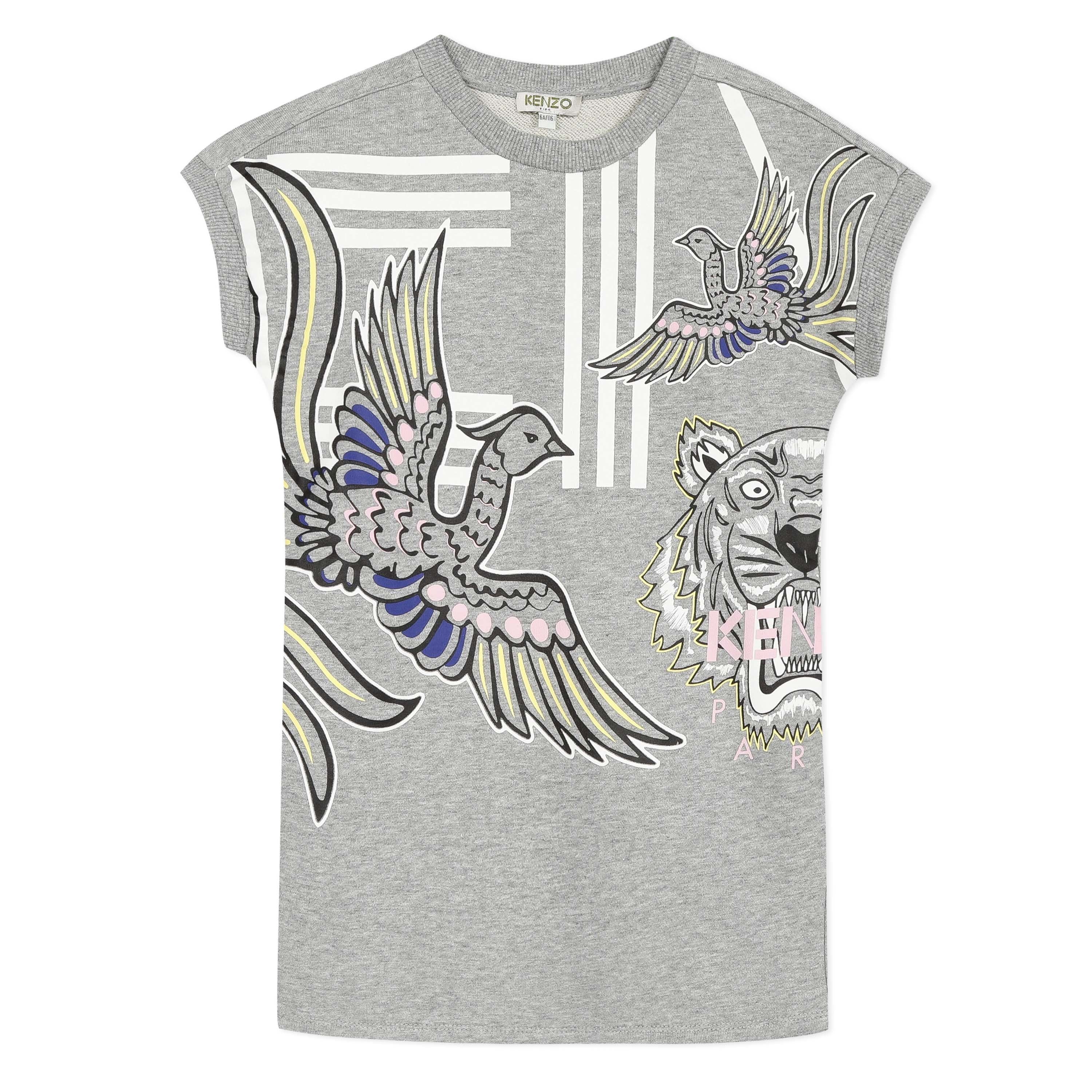 Girls grey cotton jersey dress by Kenzo Kids, made from soft sweatshirt jersey. Mid-weight, it has a fun Phoenix print in white, pink and blue, including the brand's iconic Tiger logo.