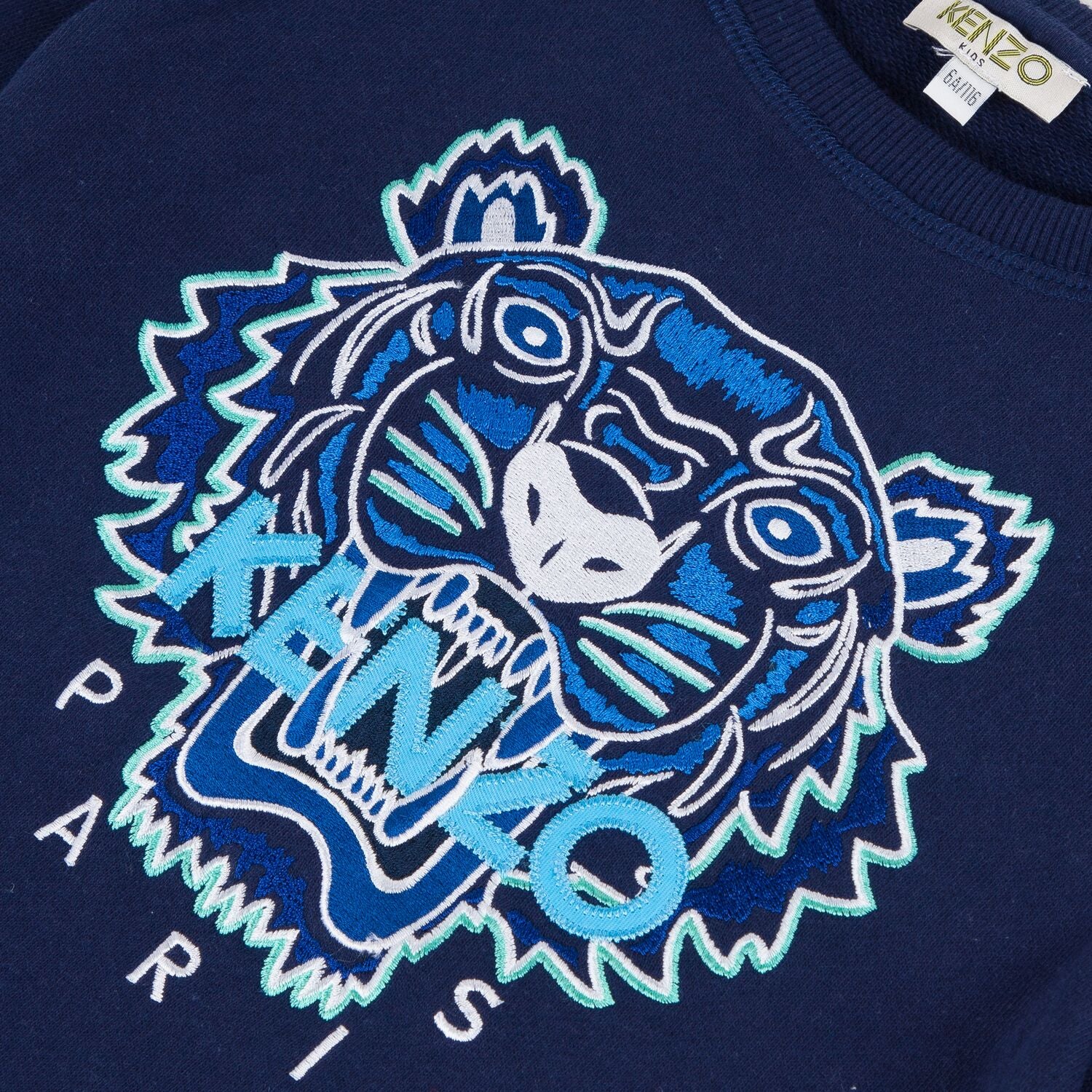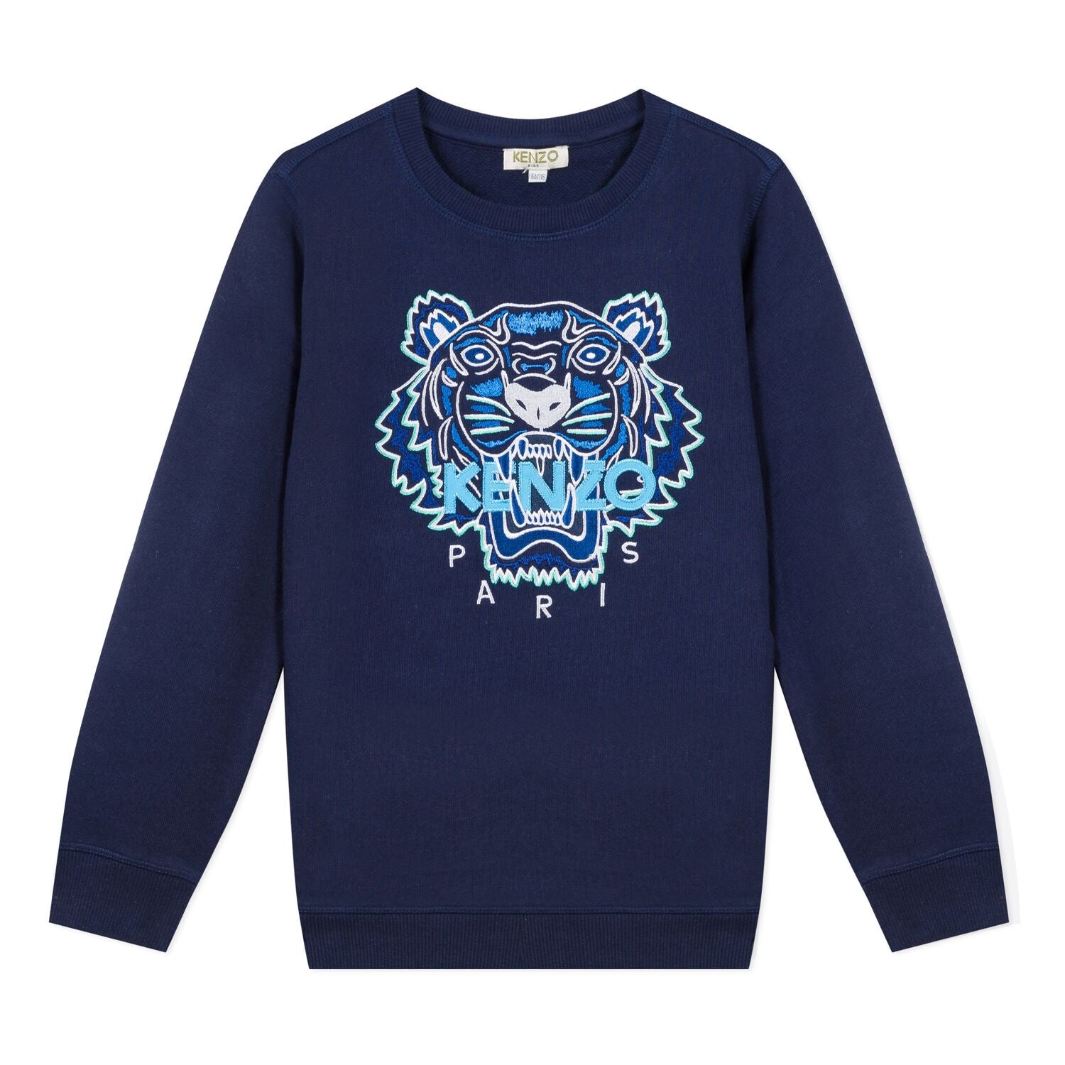 From Kenzo Kids, this navy blue sweatshirt for boys has the iconic Tiger embroidered in blue and green. It has a classic shape and is made in soft and lightweight cotton sweatshirt jersey.