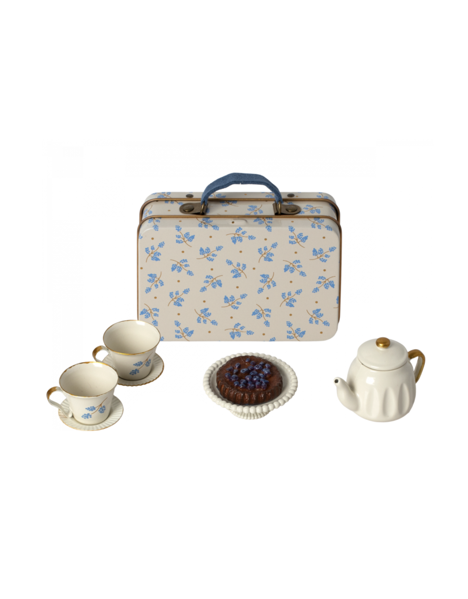 This tea set is the perfect size for a mouse paw. Each set includes all you need for a cozy moment with tea, cakes and tableware. It comes in a metal suitcase, lovely decorated with Maileg print.