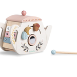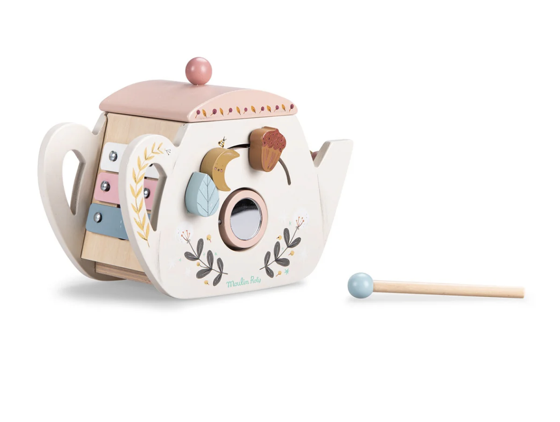 A lovely wooden activity teapot for baby! Each of the 4 sides has fun learning activities to explore: an abacus, shape sorter, cogged wheels to turn, and a xylophone. There's even a little hidden mirror!