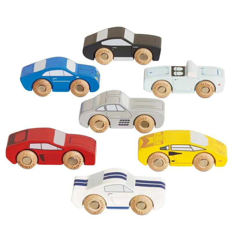 This set features 7 beautifully crafted FSCTM - certified wooden classic sports cars that are sure to ignite the imagination. Each car has been thoughtfully designed, with sturdy wooden wheels that are train track compatible,