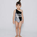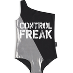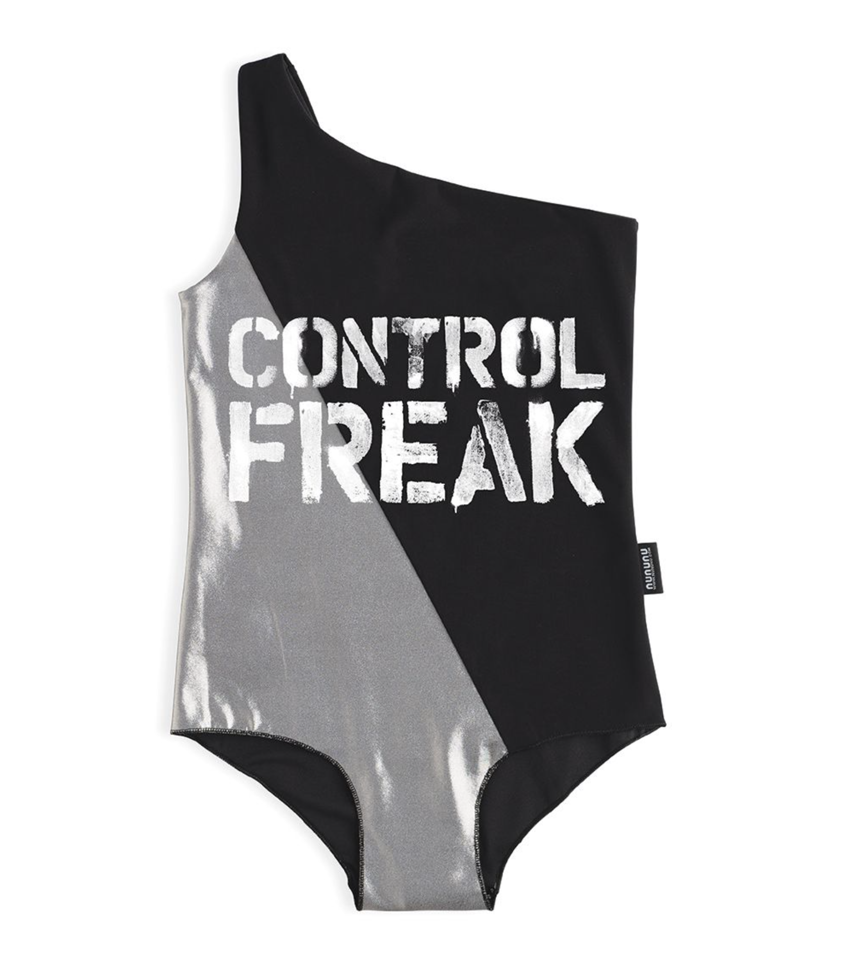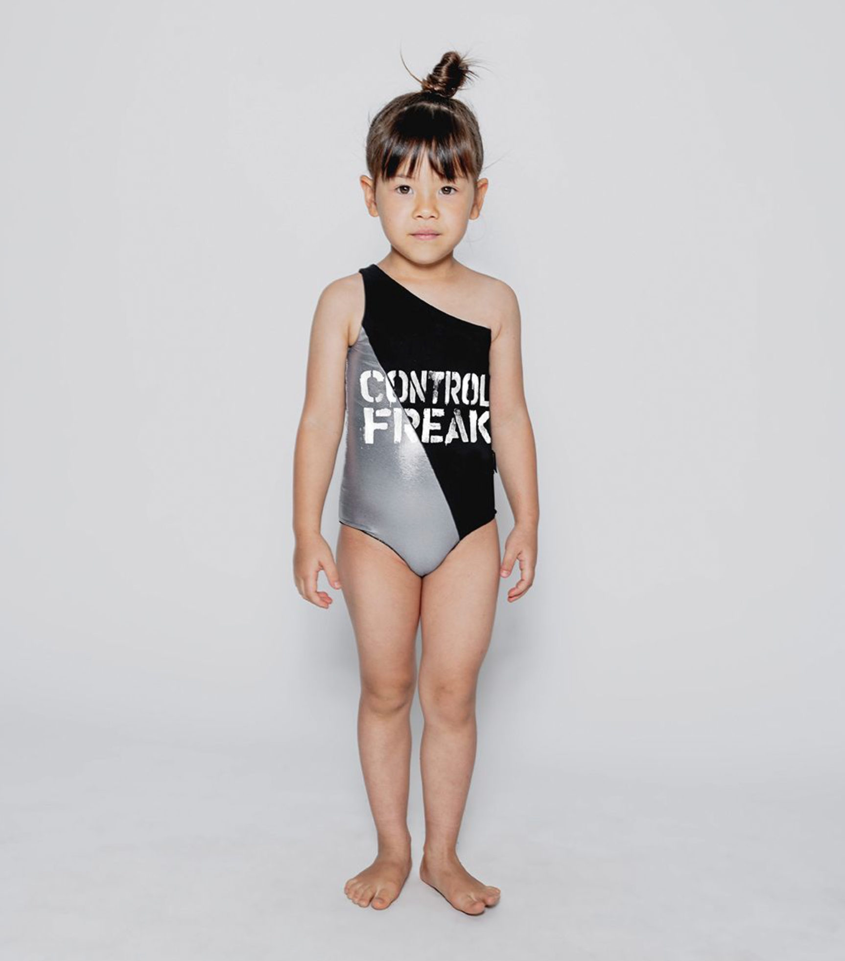 this silver & black one-shoulder tank swimsuit for girls has so many of our favorite design cues in one knockout piece. our signature diagonal color block comes half silver & half black for a futuristic feel. the one-shoulder top continues the asymmetry theme, while the rest of the cut stays classic. the words “control freak” are stencil-sprayed on the front in white, for fair warning. style her with pants or a skirt for a look that works out of the water.