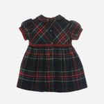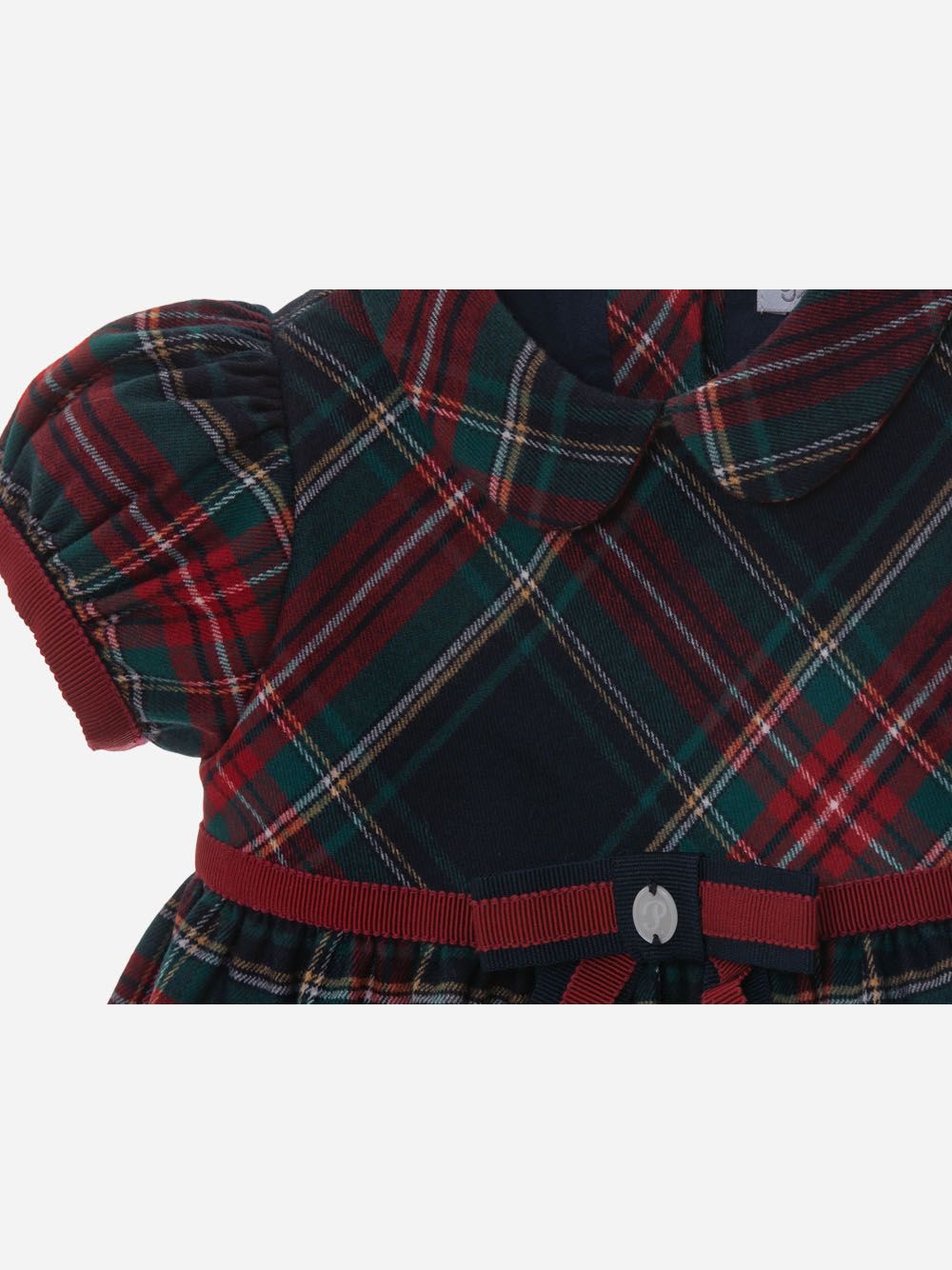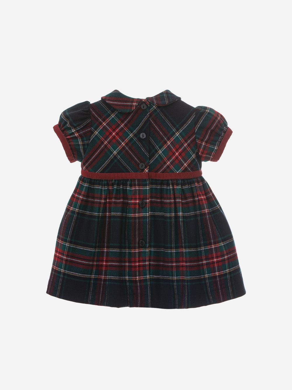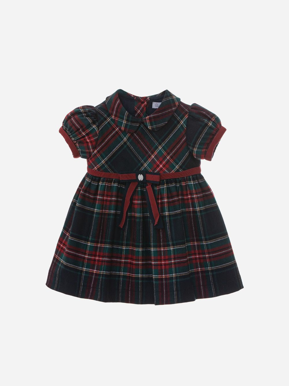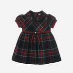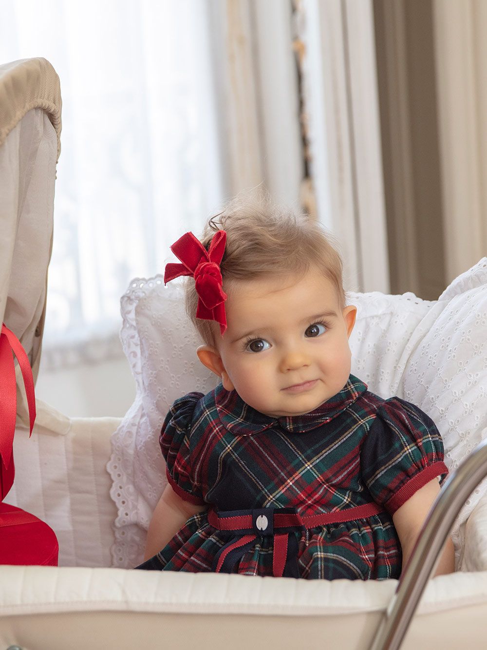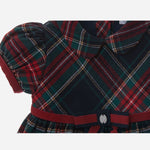 This super sweet Patachou dress is made from a navy tartan flannel. It has a red belt with a bow that gives this dress the structure it needs. It's fully lined for the comfort and protection of your baby girl.