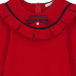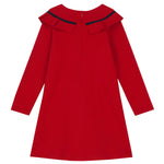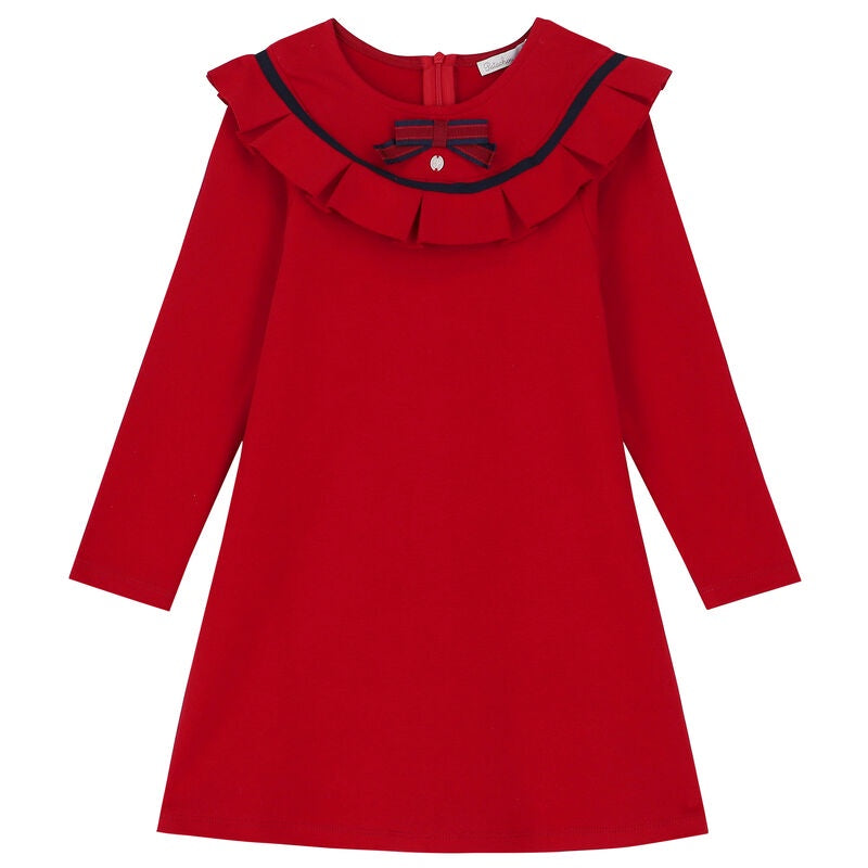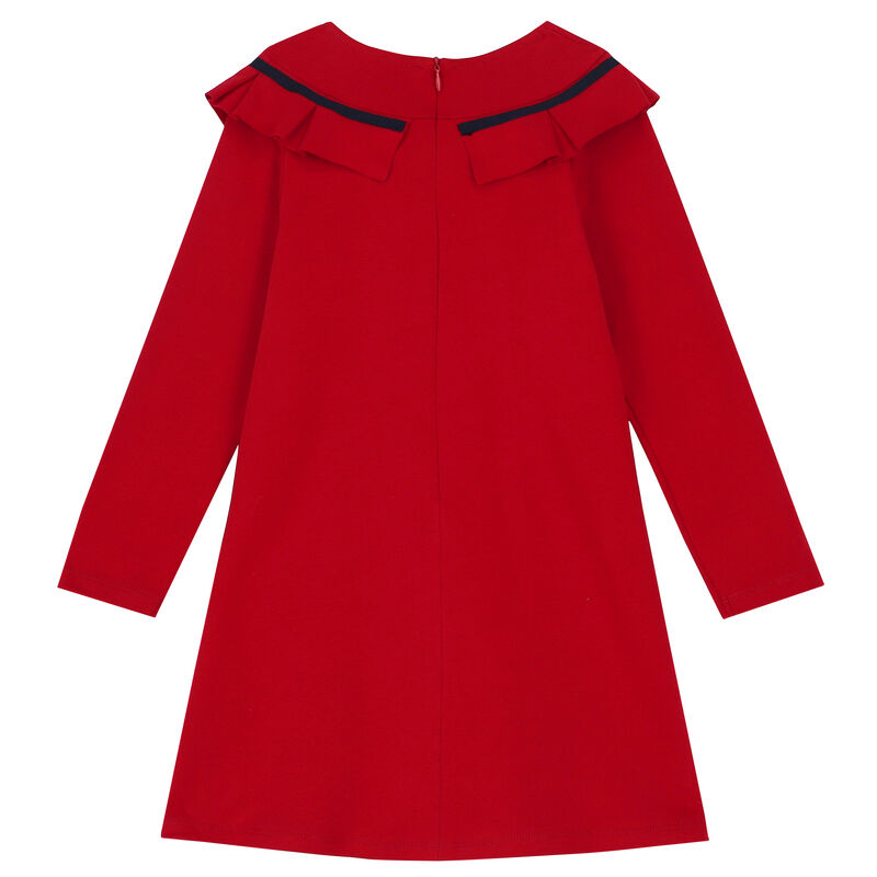 Red ruffled dress for girls by Patachou. Made from soft cotton, it features ruffled collar and navy and red grosgrain ribbon with the brands charm on the chest. It fastens with zip at the back.