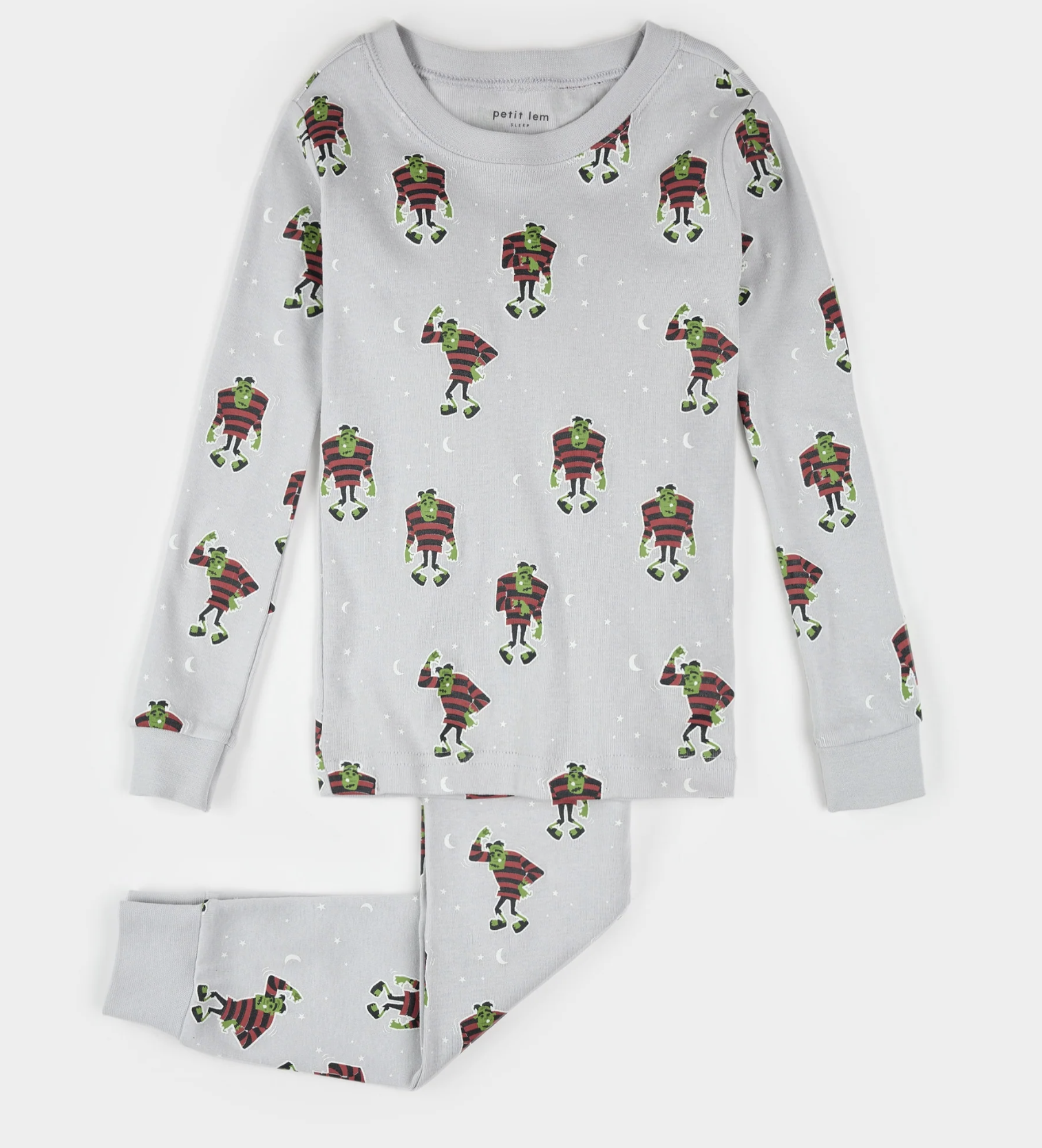 Let them embrace their inner monster with this glow-in-the-dark Frankenstein-print PJ set! The playful set is made from organically grown cotton rib for a comfy fit from day till night and it’s finished with ribbed cuffs and ankles. Perfect for spooky sleepovers and happy haunting, there’s a matching footed sleeper available for little monsters.