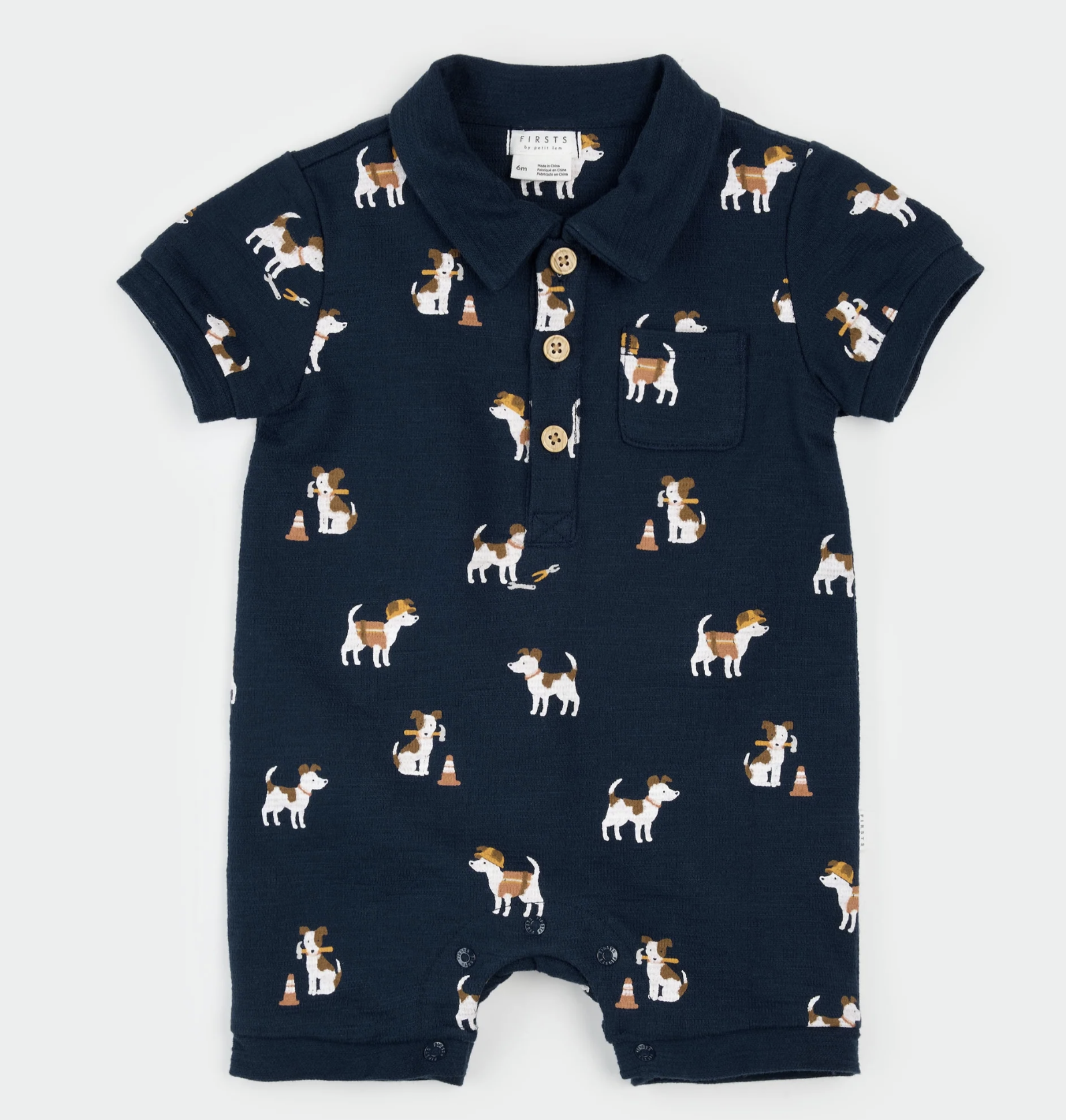 A playfully adorable romper scattered with our all-over Pups at Work print. Perfect for your little dude who’s always just trying to help, this sweet romper made with organically grown cotton beach terry gives him the flexibility to do just that. The polo collar adds a smart-casual style while the snap buttons allow for quick changes.