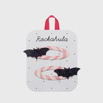 Glide through the night sky with our bat clips this halloween! Each little bat is made with in soft black glitter and is sat upon a stripy pink ribbon wrapped snap clip.
